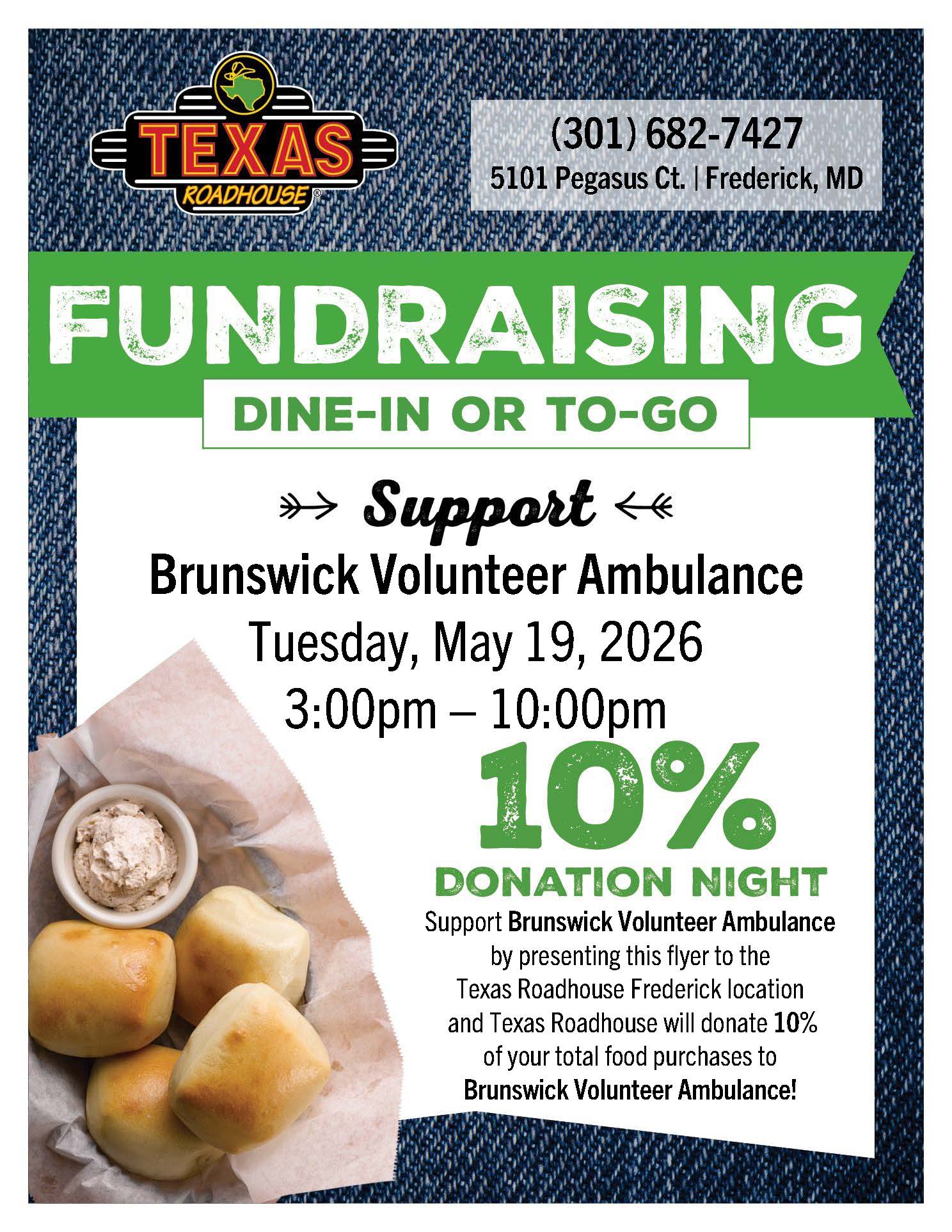 Support the Brunswick Volunteer Ambulance by presenting this flyer to the Texas Roadhouse Frederick location and Texas Roadhouse will donate 10% of your total food purchases to